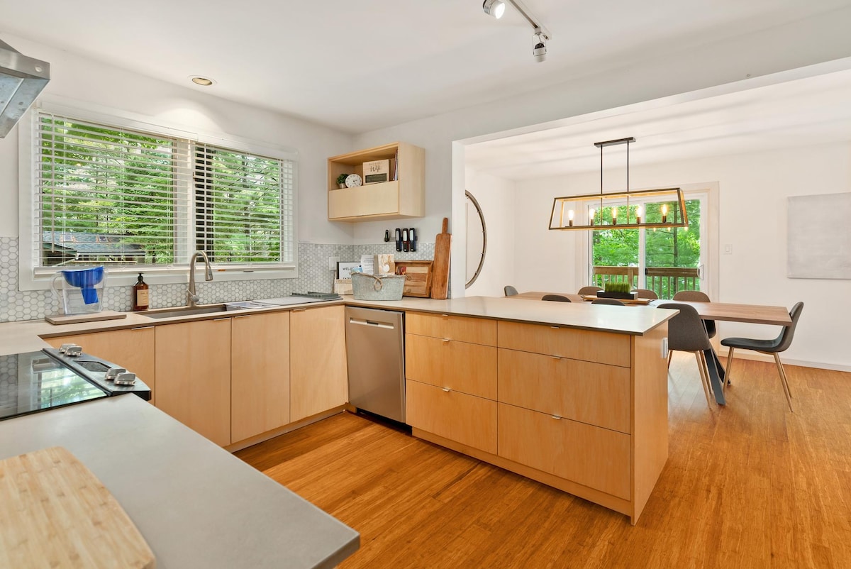 Designer Waterfront Retreat l Dock Kayaks Firepit