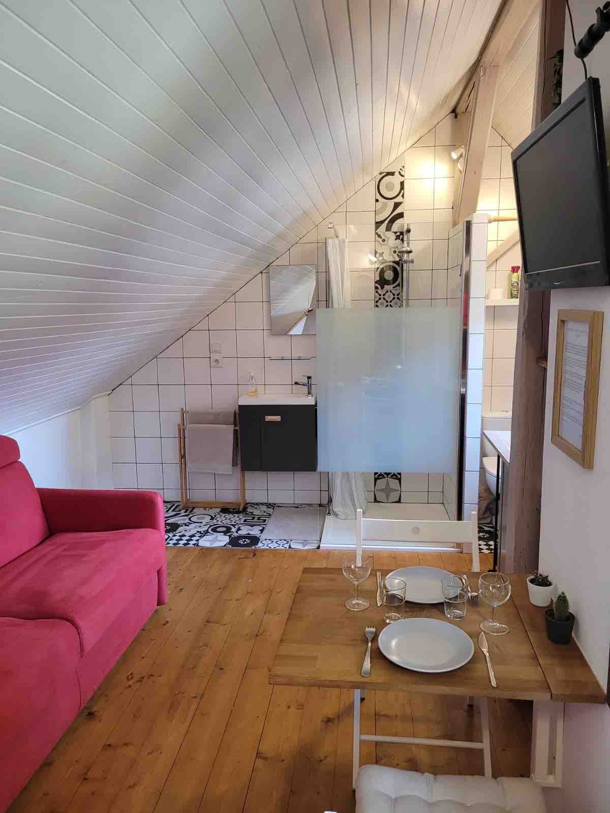 2階にある改装済みのアパート、独立した玄関。テレビ付きの寝室、ソファーベッド、机、テレビが備わった部屋、設備の整ったキッチンエリア、ダイニングエリア、シャワーとトイレ付きのバスルーム。高速Wi-Fiと駐車場。私たちは現地に住んでおり、どんな質問にもお答えします。ストラスブール中心部から15分、ゼニスから5分、アルザスワイン街道から10分、ヨーロッパパークから45分の場所にあります。 出張者に適した宿泊施設