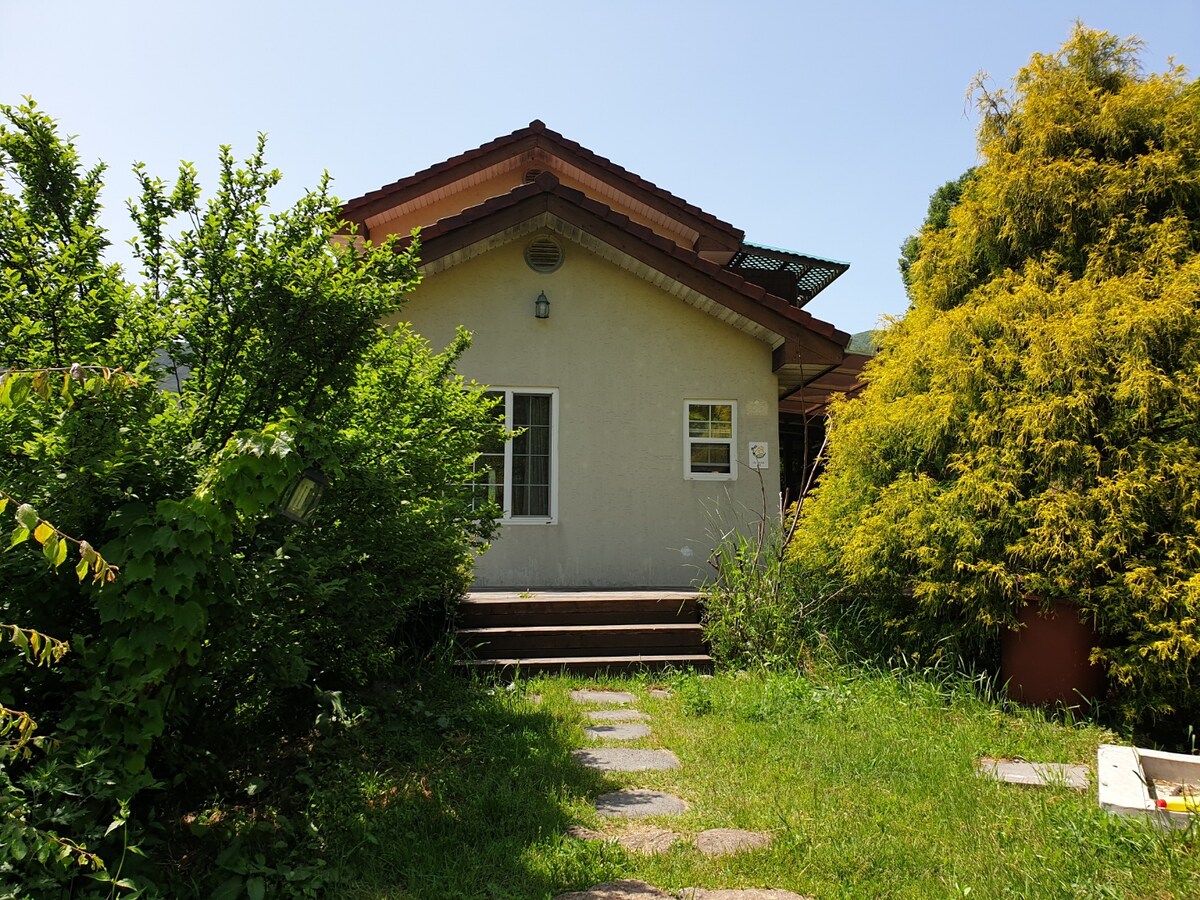 펜션형식의 민박, 2019년 전원주택 신축, 부속건물로 좌측에 다목적창고(20인석 탁자와 의자 활용 회의나 회식 가능)와 우측에 별채있음. 다만, 30평 독채중 안방 하나만은 게스트의 사용을 제한(다만, 게스트 8명 이상시 개방가능, 호스트는 아랫마을 농가주택 활용). 건물 내부 구조는 아파트 형식(힐체어 이동편리)으로 게스트가 사용할수 있는 공간은 4인실 방2, 거실(침실로 사용할 경우 8인 내외 취침할 수 있음, 응접의자, 49"TV, 에어컨, 빨래건조기, 제습기, 와이파이)1, 주방(가스렌지3구, 전자렌지3구, 6인용 식탁과 의자, 냉장고1, 김치냉장고1, 전기밥솥1, 커피폿트1, 남비 등 각종 주방용품), 화장실겸샤워실(중형세탁기1, 비데1, 세면도구 및 청소도구)2, 보일러실(각 실별 온도조절 가능)1, 창고앞에서그릴과 항아리 바베큐 가능(숯과 석쇠 등 소모품은 게스트 부담). 숙소뒷편에 대형 가스토치1, 대형스텐솥1, 중형세탁기1, 요와 이불은 게스트 인원에따라 배치.