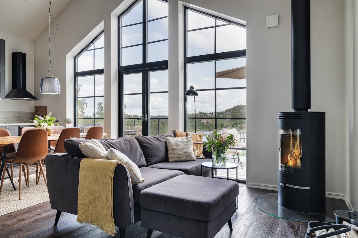 北欧デザインの家、サウナ、暖炉、湖の眺め