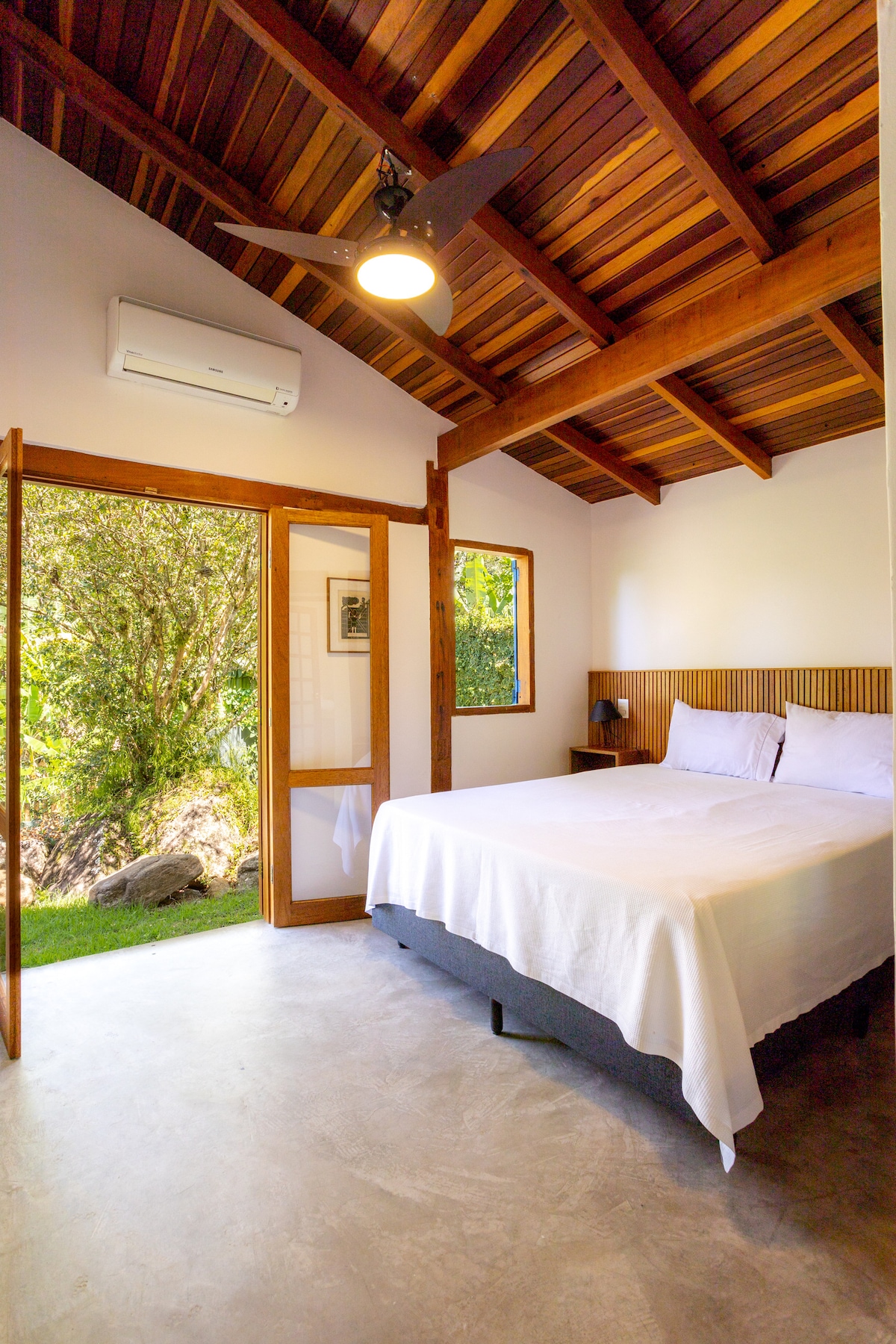 No encontro entre a urbanização e a natureza, o bangalô é um verdadeiro oásis cercado pela floresta, com um jardim tropical exuberante e o canto dos pássaros como trilha sonora. ✨ Perfeito para casais que buscam tranquilidade, conexão com a natureza e momentos de pausa. O ambiente é silencioso e prioriza o som do riacho que corta a propriedade, proporcionando uma experiência única de relaxamento. Se você procura agito, esse não é o lugar ideal. O Bangalô foi pensado para quem deseja desacelerar.