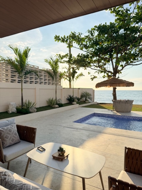リラックスできるビーチフロントの一軒家の雰囲気とキッズプール