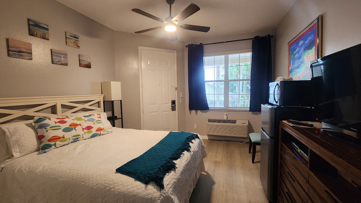 クイーンサイズベッドを備えた新しく改装されたスタイリッシュなワンルームアパートにご滞在ください。ミニ冷蔵庫、電子レンジ、無料のスターバックスKカップ付きのコーヒーキューリグがあります。無料Wi-Fiとベッドに面した50インチテレビ。IMGアカデミックまで5分、コキーナ、アナマリア島、サンクトルーズバーグ国際空港から15分です。