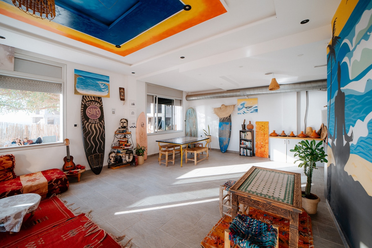 Flooka Surf & Yogaは、イムスワンの有名なカテドラルサーフスポットにあるフレンドリーなサーフハウスです。 明るい客室をご用意しており、すべてオーシャンビューと専用バスルームを備えています。インテリアは現代的なデザインと伝統的なベルベルのディテールを組み合わせ、エレガントで本格的な雰囲気を演出しています。 Flookaの精神:サーファー、ヨガ愛好家、海好きが出会い、つながる本物の温かみのある空間。
