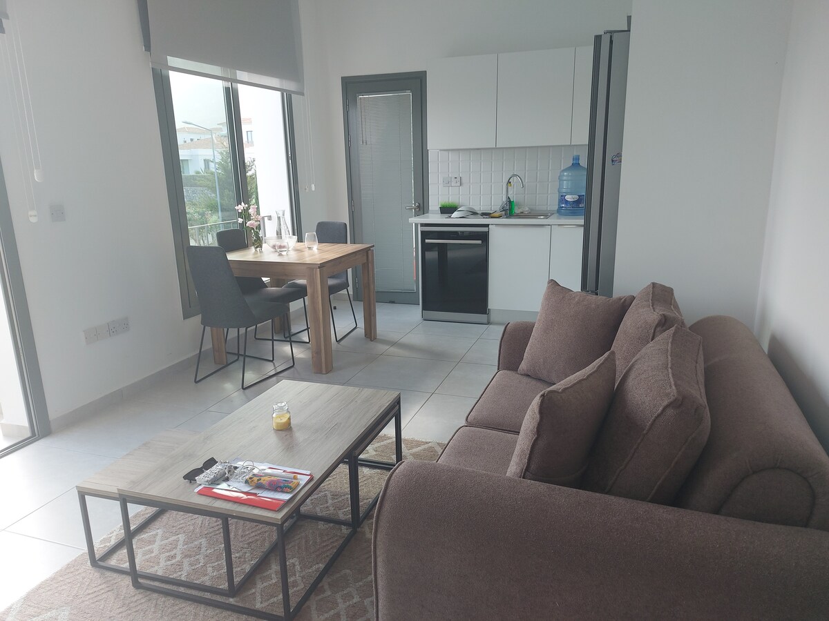 Welcome to your coastal escape in Alsancak, where sea breeze, mountain views, and Mediterranean charm meet. 🌊🏝️ This stylish one-bedroom apartment is perfect for two guests, featuring a cozy lounge 🛋️, fully equipped kitchen 🍳, and restful bedroom 🛏️. Nearby: 📍 1.5 km – Merit Hotels & Casino 🏖️ 3 km – Escape Beach 🌳 3.5 km – Alsancak Park Enjoy peaceful surroundings and access to a shared pool 🏊♂️. Relax, recharge, and embrace the beauty of Alsancak. 🌅