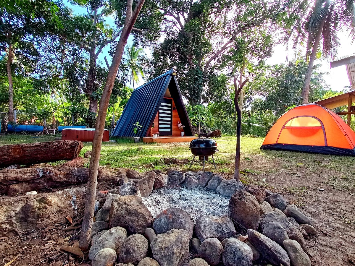落ち着ける1寝室のAフレームタイニーハウス、バスタブ付きのキャンプ場