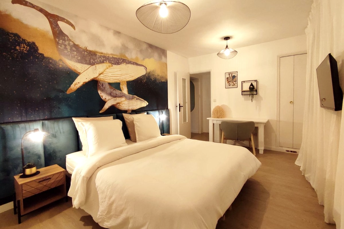 Au cœur de la ville, profitez de mon bel appartement chaleureux de 43 m², proche de tous commerces. Il est composé d'un grand séjour/salon, cuisine équipée (four, micro-onde, plaque vitrocéramique, grille pain, bouilloire…), chambre, salle de bain, douche, WC, lave-linge, Wi-Fi fibre, sticks de café, thé et sucre (cafetière Bosch). Stationnement gratuit à proximité dans la rue. Draps, serviettes et essentiels fournis (sauf gel douche). Arrivées anticipées et départs tardifs sous conditions.