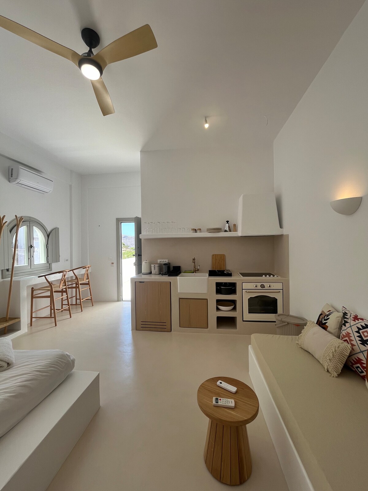 ジャグジー付きの広々とした屋外エリアでご家族やお友達と忘れられないひとときを過ごしたり、屋内のリビングルームでくつろいだりしてください。 45平方メートルの1ベッドルームスイートで、最大5名様までご宿泊いただけます。 クイーンサイズベッド1台、石造りのシングルベッド3台、レインシャワー付きバスルーム、設備の整ったキッチン、バルコニー2台があります。 全エリアでスマートテレビと高速Wi-Fiが利用できます。 イオス島の港やミロポタスのビーチまで2 kmです。 イオスの旧市街までわずか150mです。