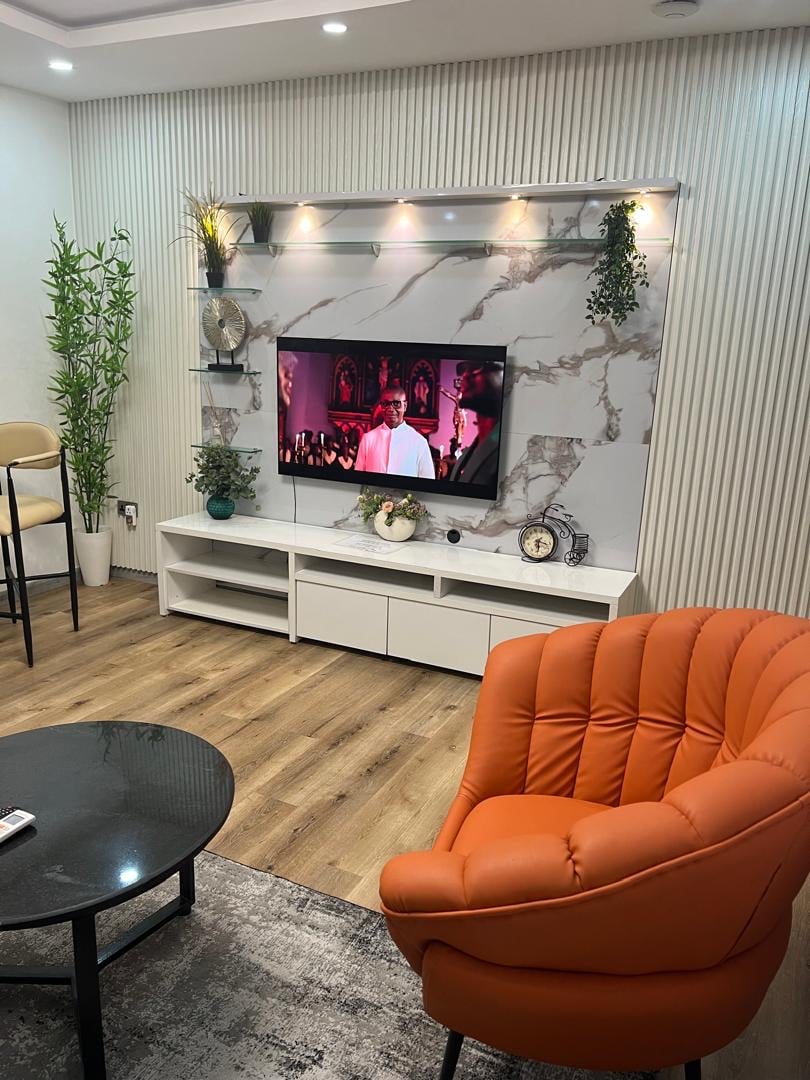 Spacious sitting room and royal ensuite room with Super king bed, modern bathroom and toilet 🚽. Very clean and standard apartment. Royal Pent House gives you all modern comfort beyond your imagination with unlimited high speed WiFi, 43inchSmart Tv in the bedroom and 55inch Smart Tv in the sitting room, YouTube, Netflix, DSTV. Comfortable Sofa, Water heater, Water kettle, Microwave, Cooking gas. Smoke Alarm, Mono dioxide Alarm, 24/7 power. , Cctv, maximum security with 24/7 security personnel