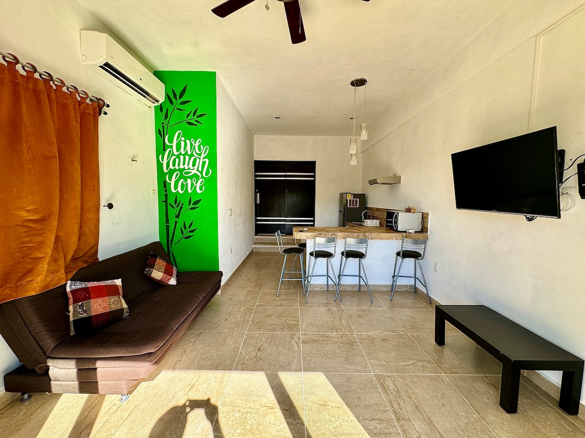 Ideal for couples and lone travelers! The studio Ixpuh 1 is a 10-15 minute taxi or golf cart ride from Playa Norte and downtown. It has a king size bed, full kitchen, private bathroom, air conditioning, Wifi and flat screen TV. Guests have access to the property's pool and patio. Very close to the studio guests can find several restaurants, fruit stands, laundries and the largest supermarket in the island.