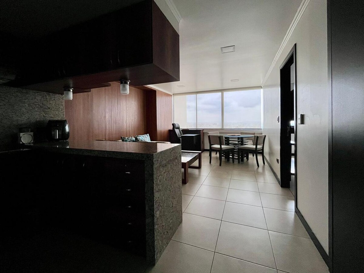 グアヤキルの中心部にあるモダンでエレガントなスイートをお楽しみください。快適さ、スタイル、実用性を提供するように設計されています。出張や都会での休暇に最適なこの空間は、贅沢さと絶好のロケーションを兼ね備えています。 最大3名様までご宿泊いただけ、設備の整ったキッチン、エアコン、高速Wi-Fi、スマートテレビを完備しています。 マレコン2000から徒歩圏内にあり、レストラン、ショップ、市内の主要アトラクションに近いです。