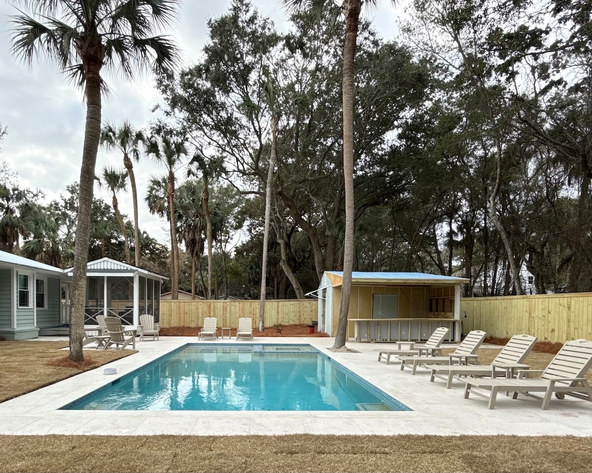 わが家へようこそ!このゲストハウスはプライベートで、専用のエントランスがあり、メインハウスに隣接しています。クイーンベッド2台、ソファ1台、折りたたみマットレス1台で4名様がご宿泊いただけます。Wi-Fi、洗面用品、リネンとタオル、アイロン、ヘアドライヤー、フルキッチン、ビーチ必需品、コーヒーと紅茶をご用意しています。静かな裏庭の小川のそばに座って水鳥を眺めたり、車で数分でフォリー・ビーチやダウンタウンに冒険に出かけましょう。MUSCまで6分。裏庭は共用です
