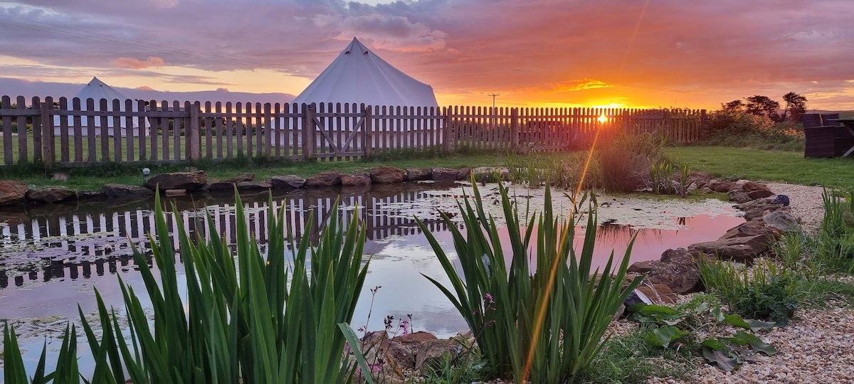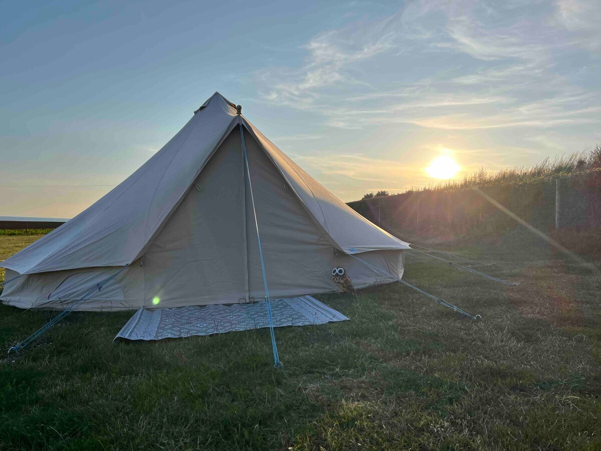 日常から離れて星空の下で過ごしましょう。地元の村のパブまで徒歩すぐで、美しいビーチや森の散歩まで車で5分です。 ベルテントは村の中心部にある私たちの家畜農場にあります。 広々としたベルテントには4人用のベッド、バーベキュー、2つのバーナーのガスコンロ、鍋、フライパン、調理器具、カトラリー、毛布が備わっています。寝具を持参するだけでOKです。 敷地内にトイレとシャワーが2つあり、清潔な水を使った洗浄設備があります。電気はありません