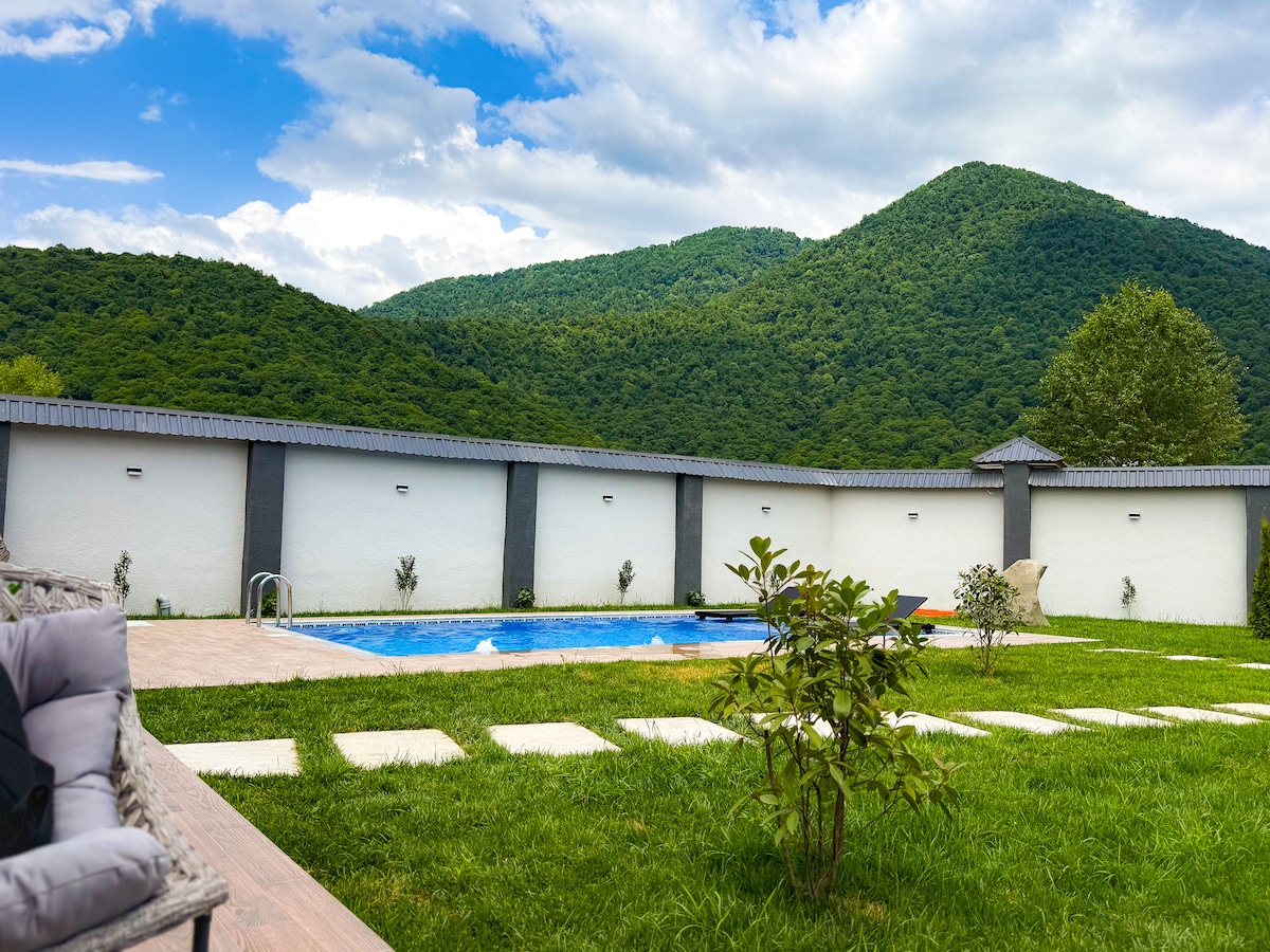マウンテンビュー・ヴィラ・ガバラへ🏡ようこそ。素晴らしい山の景色、プライベートプール、屋外バーベキュー、無料駐車場を備えた、スタイリッシュで家族向けの宿泊施設です。天井の高い快適なオープンコンセプトのインテリア、自然光、高速Wi-Fi、必要なすべての快適さをお楽しみください。リラックスしたり、探索したりしたい家族連れ、カップル、お友達に最適です。自然の中で目を覚まし、プールサイドでくつろぎ、星空の下で思い出を作りましょう。