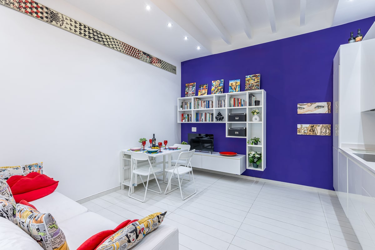 A newly renovated apartment where vintage, retro and colonial styles mix. A stone's throw from the Central Station, in an early 1900s Liberty building, we host you in a three-room apartment with a Bohemian touch: large, bright and elegant, where refined materials cover the floors with Carrara marble and Teak parquet, round arches create niches in the walls and synergies between the rooms, turquoise Moroccan zelliges cover the bathrooms and meet warm enamels in ultramarine colours.