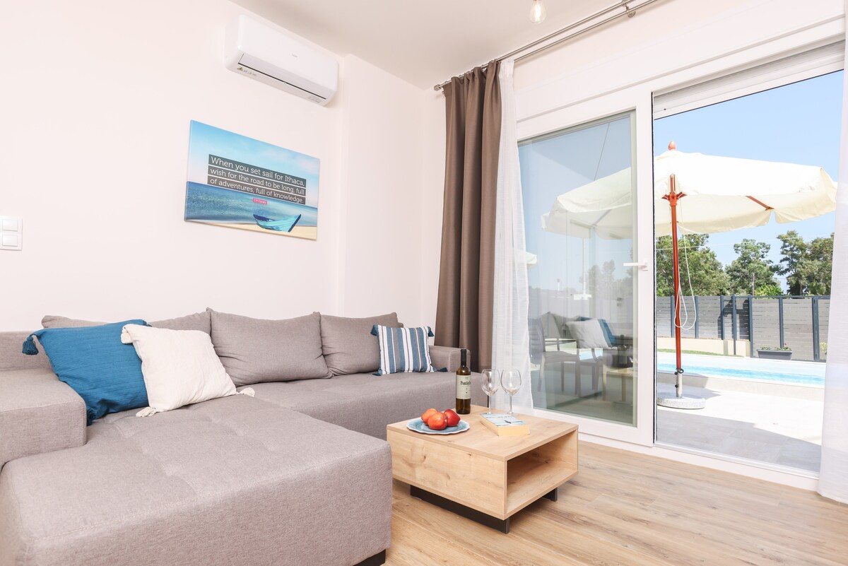 新築の家「Kalithea」は、コルフ島のペトリティの絵のように美しい村にあり、海、ペトリティの絵のように美しい港とビーチ、そしてオリーブの木で覆われた周囲の山々を望むことができます。家にはエアコン、無料WiFi、スマートテレビ(Netflix)を備えた客室があります。