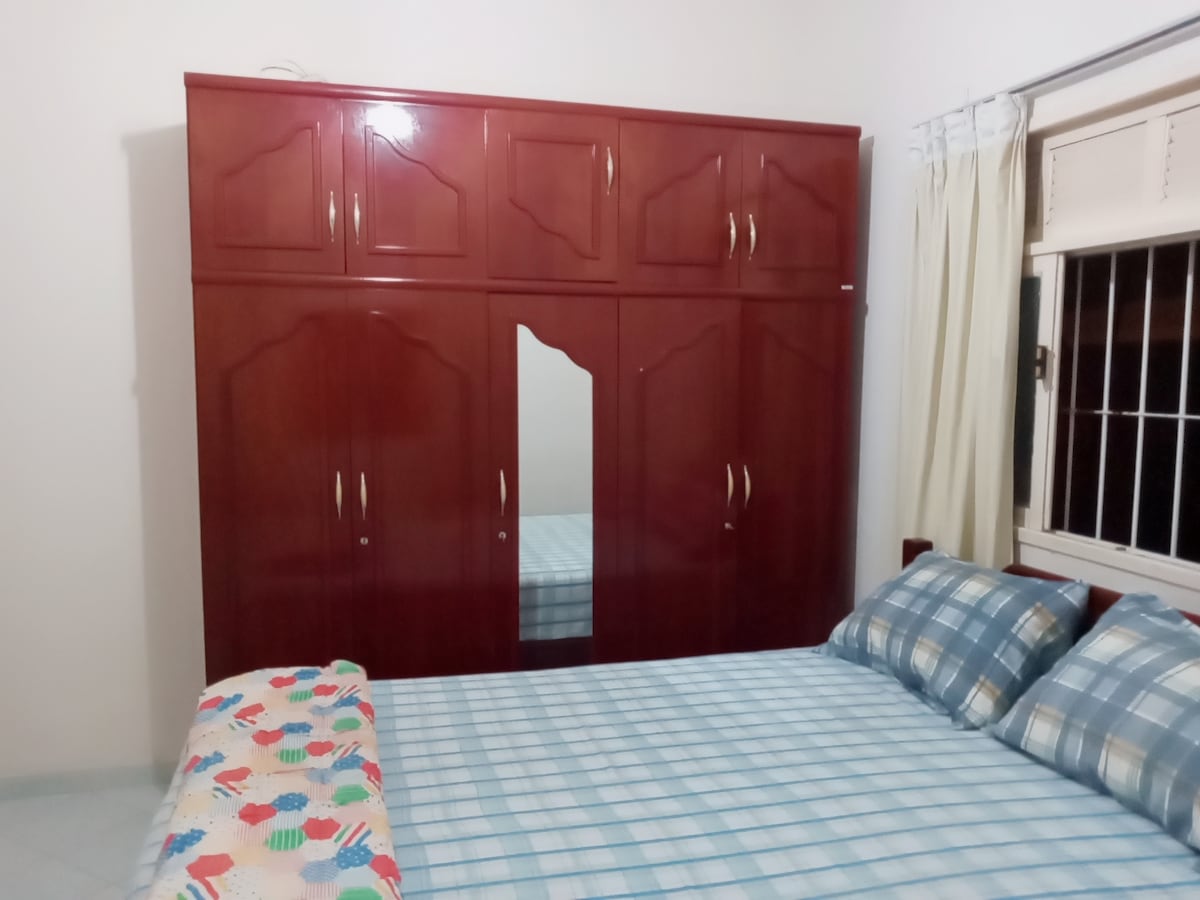 a kitinete é muito espaçosa, contém um quarto grande com uma cama de casal, uma beliche, uma mesa com 4 cadeiras., um espelho e tv, tem uma cozinha com fogão, geladeira , airfray, sanduicheira, cafeteira e utensílios, . banheiro com chuveiro elétrico e uma varanda coberta que cabe dois carros. Se precisar, cabe mais duas pessoas com colchão no chão, para isso entrar em contato com a anfitriã para colocar os colchões. o valor por excedente deverá ser incluso na reserva.