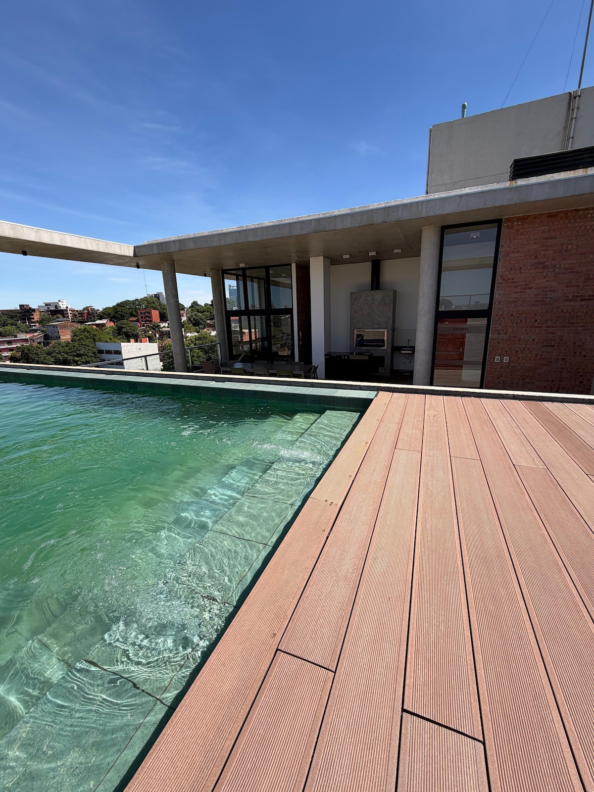 Este elegante alojamiento es ideal para vos. Cuenta con dos habitaciones climatizadas y un toque colonial en la iluminación. La sala es espaciosa con una vista de ensueño hacia el Río. El sofá, que combina con el resto de los modulares, brinda un espacio cómodo, para que te relajes, mientras ves la tele o trabajas con tu laptop. La cocina, brinda un espacio ordenado y muy bien equipada. Y por supuesto la piscina que puede usar en todo momento, con un quincho y video de seguridad las 24 horas.