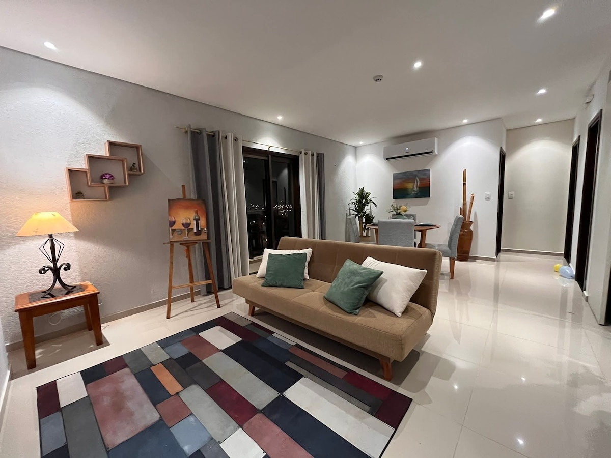 Apartamento con balcón vistas al río y excelente ubicación!📍. A pocos pasos de la Costanera, Playa San José🏖️, restaurantes🍴 y de Shopping Costanera 🛍️. Habitación principal con cama matrimonial 🛏️, sala con sofá cama(2.10 x 0.95 x 0.92) 🛋️, comedor, cocina integrada y baño moderno 🚿 Seguridad 24/7 🔒 y servicio de lavandería dentro del edificio para tu comodidad. Aires Splits en habitación y sala-comedor.