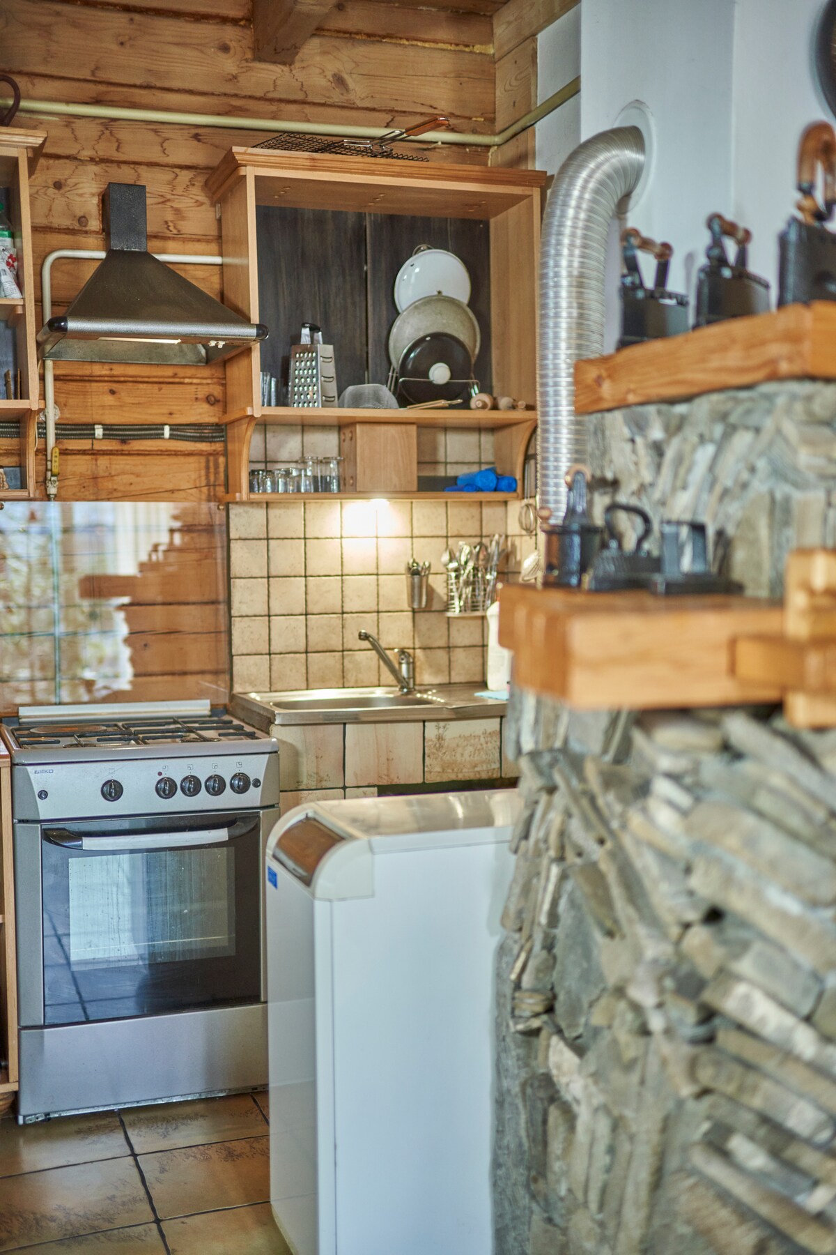暖炉付きの3階建ての木造コテージ。1階:ソファ、テレビ、暖炉を備えた広いリビングルーム、大きな楕円形のテーブルを備えた設備の整ったキッチン、シャワー付きバスルーム。 2階にはバスルームが2部屋あり、整形外科用マットレス付きの大きなベッド、テレビ、鏡、ベッドサイドテーブルが備わっています。 3階には、シングルベッド、テレビ、ベッドサイドテーブル、バスルームを備えた寝室があります。 敷地内には2つの駐車スペースがあります。