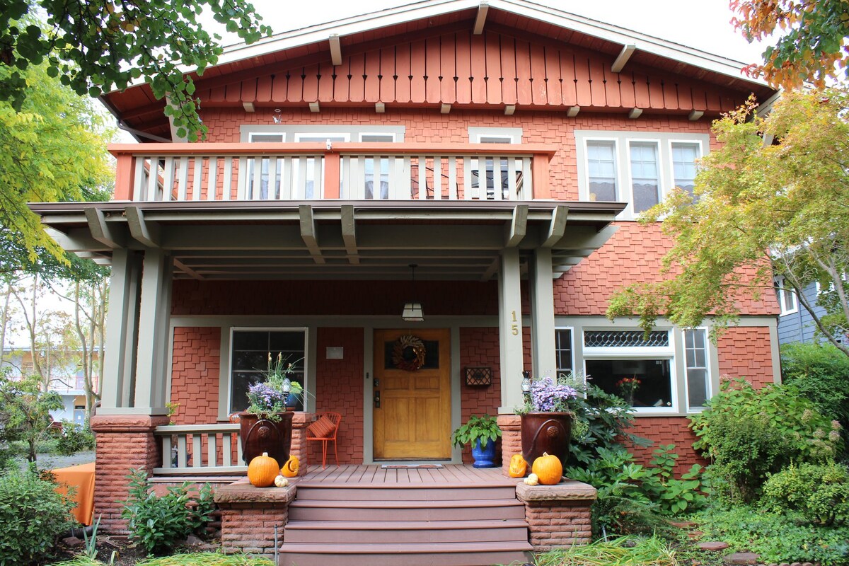 Just steps from Ashland's vibrant restaurant and theater district. Quiet comfort amid a charming post-Victorian atmosphere. Elegant rooms, each with its own private bath and shower. Complimentary wine upon arrival. Coffee/tea available 24 hrs on our Hospitality Landing, just outside your room. Self-serve continental breakfast in dining room of on our beautiful shaded deck, 7 days a week.