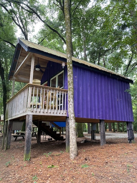 This one-bedroom cabin features a studio set-up, with a comfortable queen bed, efficiency kitchen including a microwave and refrigerator. The home also contains a well-appointed bathroom, features heat and air, and comes with towels and linens. No TV or WiFi. *Please note this is cabin #4 at Ocmulgee River Retreat* Additionally, Ocmulgee River Retreat operates on well water and we do not recommend drinking from the tap. Reminder that there is train that makes daily/nightly runs.