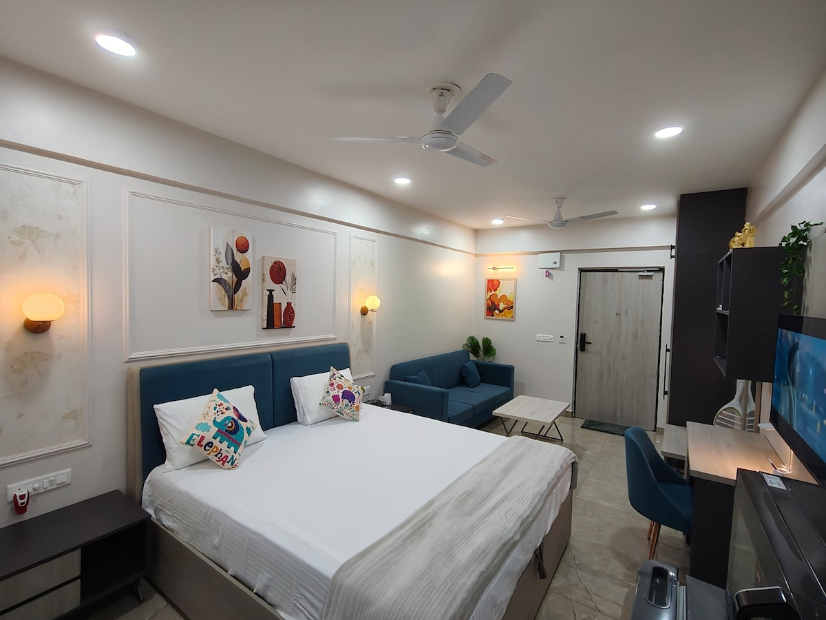 The Starlit Staysへようこそ。ここは、一人旅の方やカップルに最適な、居心地の良いモダンなワンルームアパートメントです。ショッピング複合施設、雑貨店、医療施設から徒歩圏内にあり、理想的な都会の隠れ家です。テレビ、Wi-Fi、エアコン、煙突、冷蔵庫、RO浄水器、ガス、エレベーターなどのスマートなアメニティ・設備をご利用いただけます。24時間年中無休のCCTVセキュリティで、安全で快適な滞在をお楽しみいただけます。快適さとつながりを重視して設計された、静かでスタイリッシュな隠れ家。