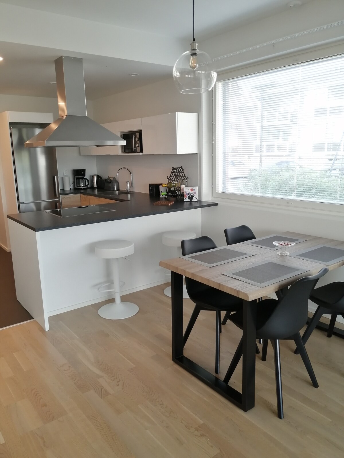 最高のロケーションとコストパフォーマンス!市場の近くの静かな家にある、ガラス張りのバルコニー付きのワンルームと無料の駐車スペース。駅、キャンパス、ショップ、レストラン、スイミングプール、アイスアリーナ、イベントパークが徒歩圏内にあります。隣には遊び場があります。実用的な多目的スペースには、リネンとタオルが用意されています。大人1〜3人または3〜5人家族の短期滞在に最適です。セルフチェックインは15時30分からです。チェックアウトは12時00分です。