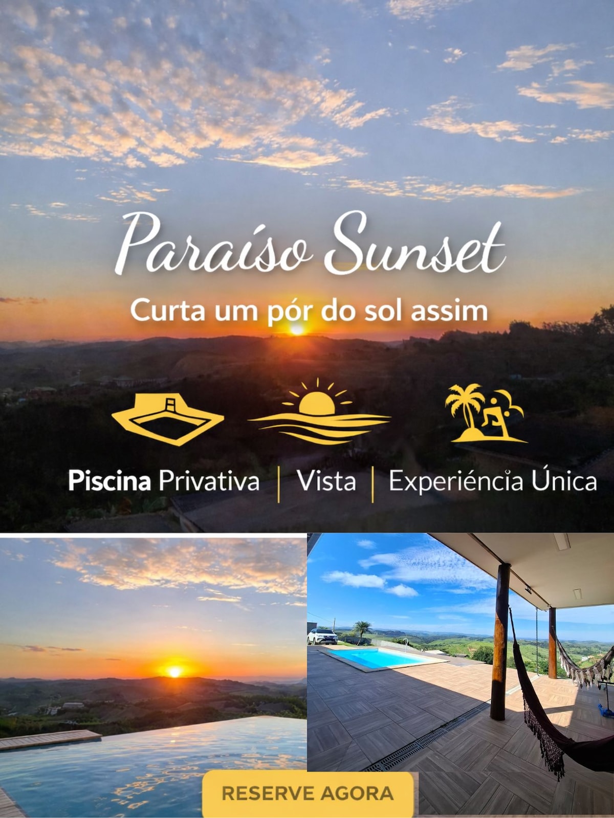Bem-vindo ao Paraíso Sunset, um refúgio exclusivo O grande destaque é o pôr do sol espetacular, que transforma cada fim de tarde em um momento único e inesquecível. A propriedade conta com uma piscina privativa, área externa ampla, vista panorâmica incrível das montanhas, ideal para relaxar, reunir a família ou curtir momentos especiais. 🌿 Ambiente tranquilo e cercado pela natureza 🌅 Vista privilegiada com pôr do sol deslumbrante 🏊 Piscina perfeita para lazer e descanso