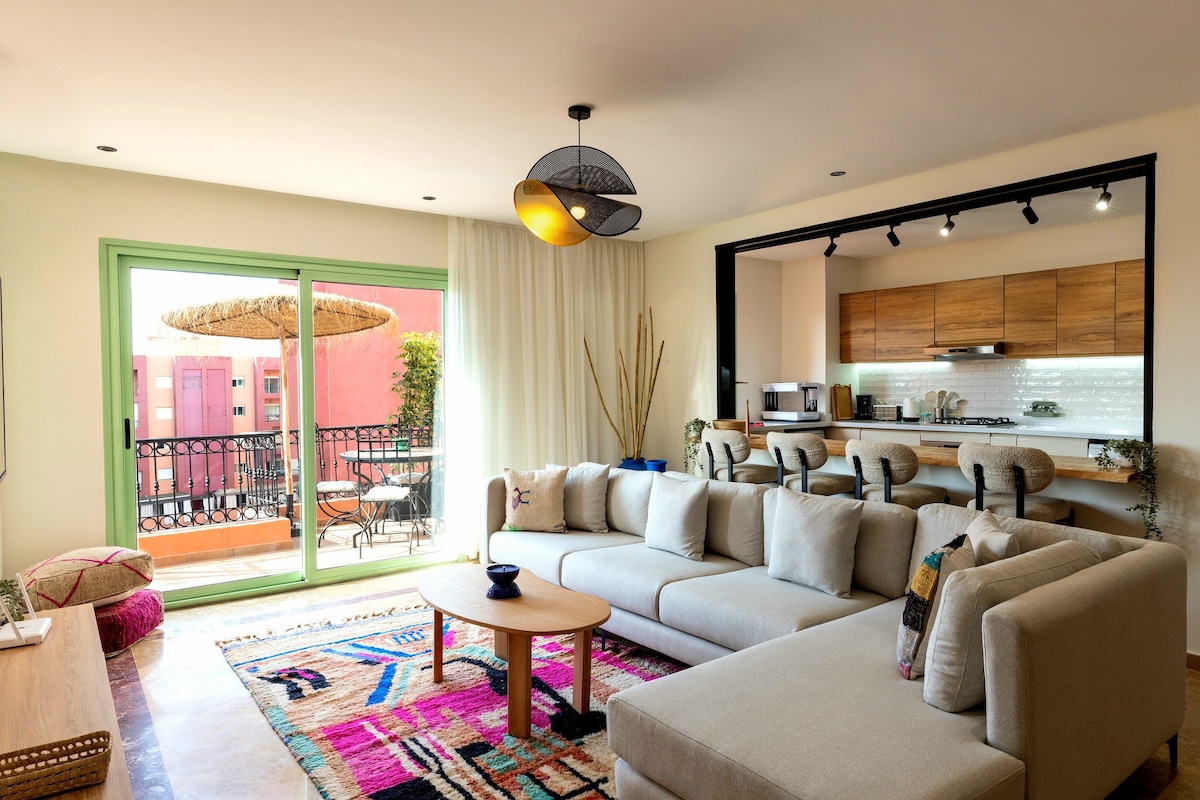 ✨ Modern 1BR Near Majorelle | Balcony & Wi-Fi Bright and stylish 1-bedroom apartment designed for comfort and a seamless guest experience. Relax in a living room with Moroccan touches, smart lighting, TV, dining area, and a fully equipped kitchen with coffee machine and washer. The bedroom features a TV and ensuite bathroom. Enjoy a private balcony with seating for two. Located in a secure residence in central Guéliz, just minutes from cafés, shops, transport, and Majorelle Garden. 🌴