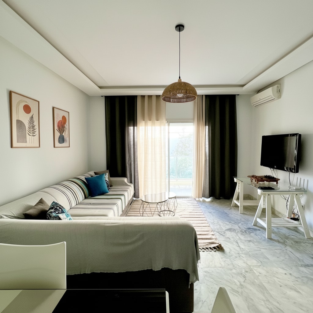 Un intérieur qui célèbre l’authenticité et qui permet d’avoir un espace de vie unique Un appart décoré avec des objets artisanaux qui racontent une histoire, chaque pièce artisanale contribue à l’originalité de notre espace. Appart situé aux Jardins de Carthage à 15mn de l’aéroport 5mn du lac 2 et du centre commercial Carrefour la Marsa, proche de toutes commodités, la Marsa, Carthage, la Goulette Appart dispose d’une place de parking au sous-sol, fibre optique, smart TV, un coin bureau