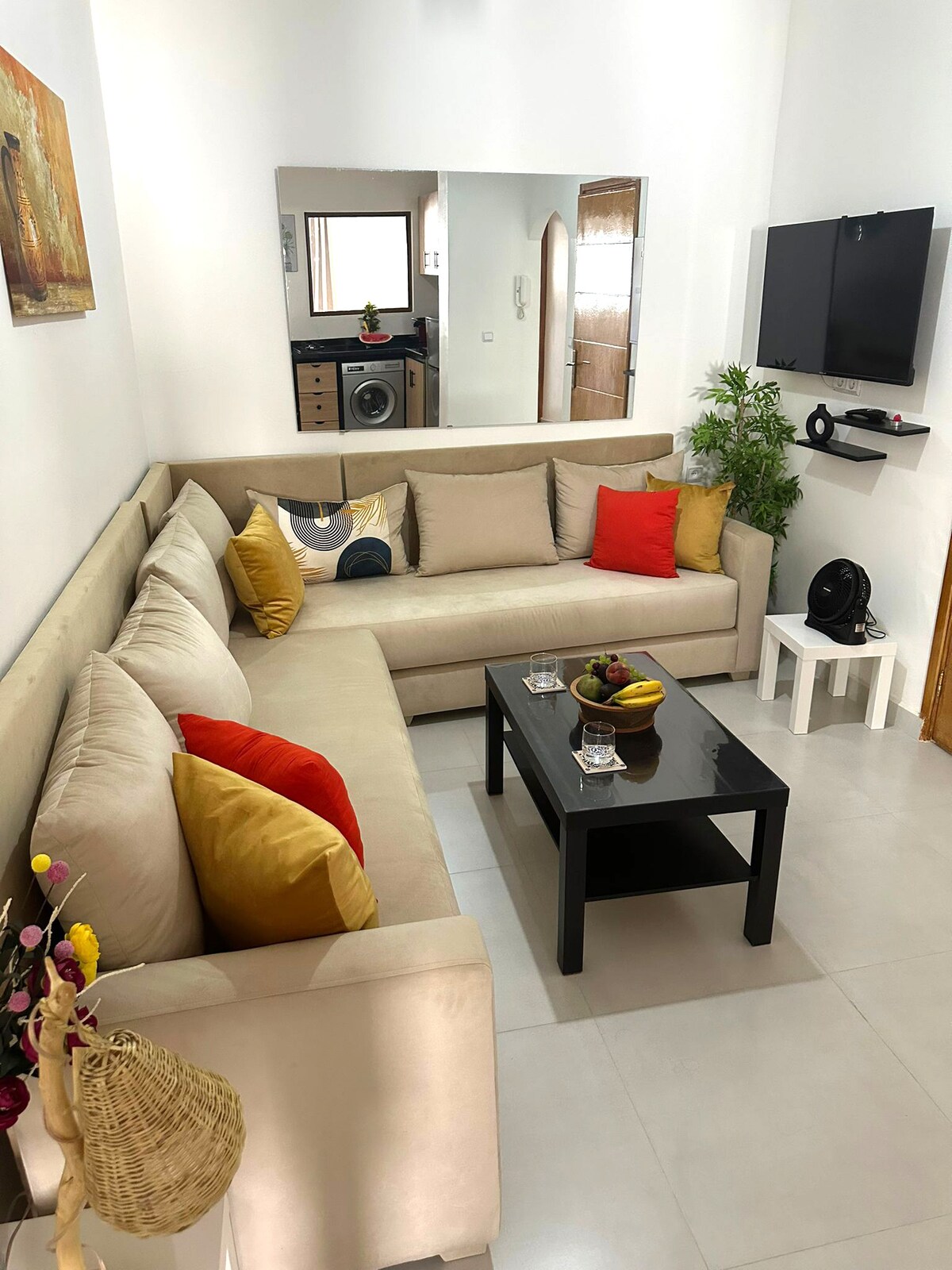Détendez-vous dans ce logement calme et élégant. Joli appartement à deux pas du GRAND STADE de Tanger Agréable et apaisant, l’appartement se compose d’un salon élégant ensoleillé avec une chambre (lit neuf 180) La salle de bain est propre et fonctionnelle Parfaitement équipé, calme et imprégné d'une ambiance cocooning, ce sera le point de chute idéal des voyageurs d’affaires et d’agrément