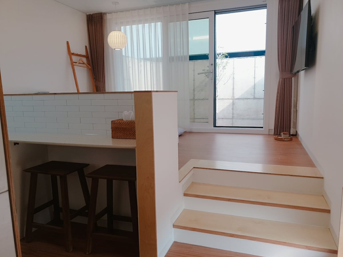 2021年6月にオープンした新築の宿泊施設です。済州の田舎の村..自分だけの空間で済州をより身近に感じてみてください。 <徒歩で行けるレストラン> The Aewol:ドルチギ、キムチチゲ、卵丸 モドルハンサン:とんかつ、ゴサリパスタなど ハガミン114:肉の麺、ビビム麺 ハガネラーメン:ランチセット サロン・ドゥ・ラ・ヴァン:(金、土、日、月)ブランチビュッフェ <徒歩で行けるカフェ> カフェ散歩、ピピアイランド、花香油、カミーノ *チェックイン:4時 *チェックアウト:10時30分 *予約人数は最大2名まで、青少年以上のみ宿泊可能です。 *簡単なウェルカムスナック(カップラーメン、ジュース、スナック、キャンディーなど)をご用意しておりますが、状況によっては変更になることがあります。 *実際に滞在するお客様が直接予約することを原則としており、家族や知人などによる代理予約はできません。 *保護者同伴なしで未成年者のみの宿泊はできません。 *口座振込で予約する場合は、OIO 6822 OII3に 日付、人数、部屋番号をお知らせください。