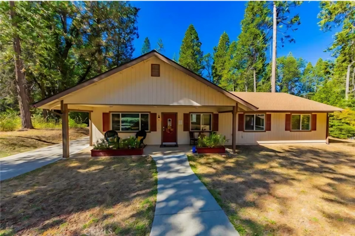 ヨセミテ国立公園近くの楽園、私たちの素敵なプライベートホームへようこそ。 ミッドパインズのYARTSバス停まで歩いて行けば、パークへのアクセスも簡単です。 12月から5月まで、敷地内を流れる季節の小川の心地よい存在を体験してください。 十分な座席とバーベキューを楽しみながら、屋外の至福を堪能してください。 柔らかいマットレスと高品質のシーツを備えた2つのベッドルームでくつろぎましょう。 設備の整ったキッチンでは、おいしいお料理を作ることができます。 夜は電気暖炉をお楽しみください。