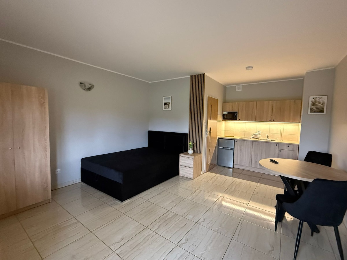 Studio apartment with terrace, equipped with: - Private bathroom - Fully equipped kitchenette - Smart TV In addition, our guests can enjoy: - Shared kitchen - Laundry room - Parking spaces - Free Wi-Fi throughout the property We offer a large garden with a fireplace and barbecue area, as well as a volleyball and soccer field. Excellent location: - 250m to the beach - 2km to the Powidz Military Base Discount for a long-term stay and cleaning service free of charge.