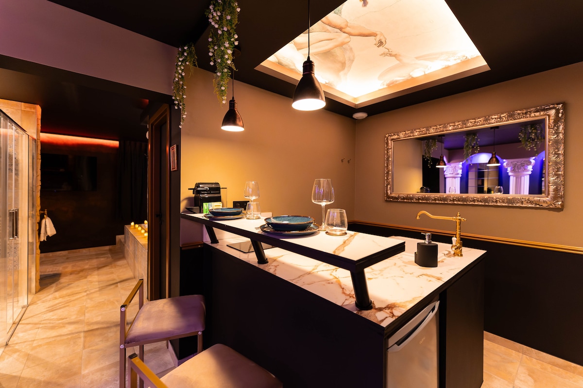 ヴィーナス・スイートへようこそ。古代ローマの歴史と情熱を味わう究極の旅へとご案内いたします。 当館の中心部に位置するこのテーマルームは、現代の豪華さとローマ帝国の壮大さが融合した世界へとお客様をお連れします。 キングサイズのベッドでリラックスし、豪華なジャグジーに浸かってください。でも、ショーの目玉は?それは、あなたの最もワイルドな空想を実現する秘密の部屋です。忘れられない体験をするために今すぐご予約を!