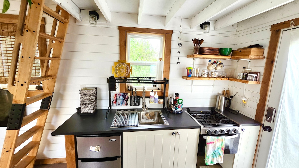 Schoaf Cottage: キングベッド/キッチン/フルバスルーム