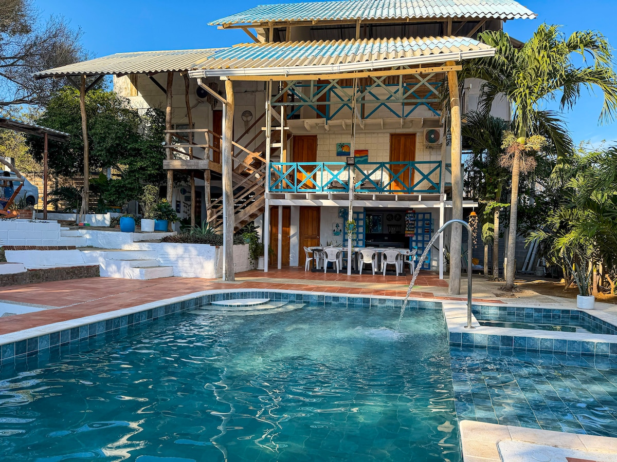 Stunning villa in Salinas del Rey! Private pool, rooftop views, workspace for nomads, and epic Caribbean vibes. Perfect for families, groups & kitesurfers. Relax, work, or ride the wind—this place does it all. Hot water is available during the day for your comfort. We have 7 double beds and two hammocks. Whether you’re here to relax, celebrate or work remotely by the sea, this house is your ideal base in Colombia’s hidden coastal gem.