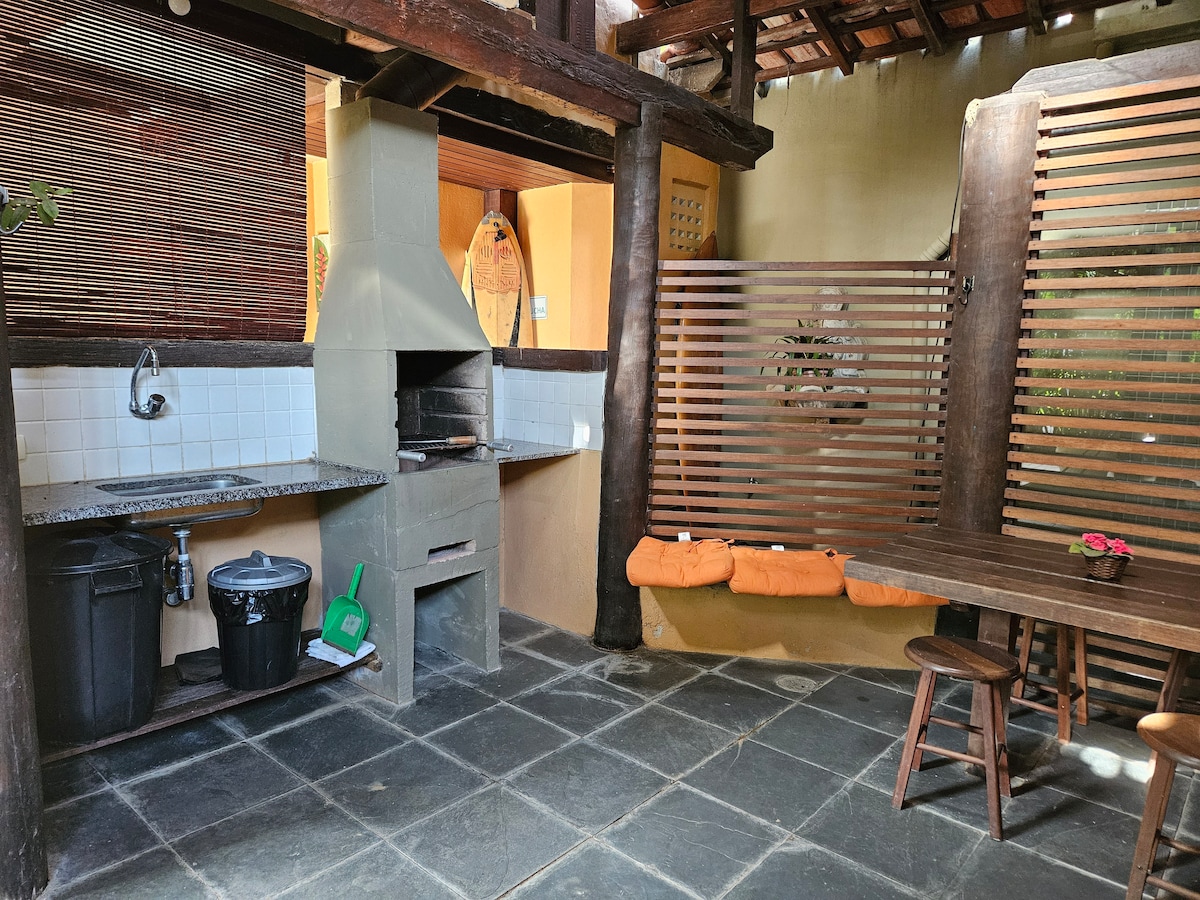ビーチから3kmの大西洋の森の中にある小さな家で、敷地内には別の家もあります。美しく、シンプルで静かな場所。カップルに最適で、装飾がよく、快適です。キッチン用品、スマートテレビ、Wi-Fi、電子レンジ、冷蔵庫、コンロ、ハンモック、ゲームが完備されています。電圧220V。バルコニー、シャワー、ポータブルバーベキューグリル、駐車場、裏のデッキ、ゲートとフェンスで囲まれた共有の敷地。森林地帯で、野生動物がいる可能性があります。