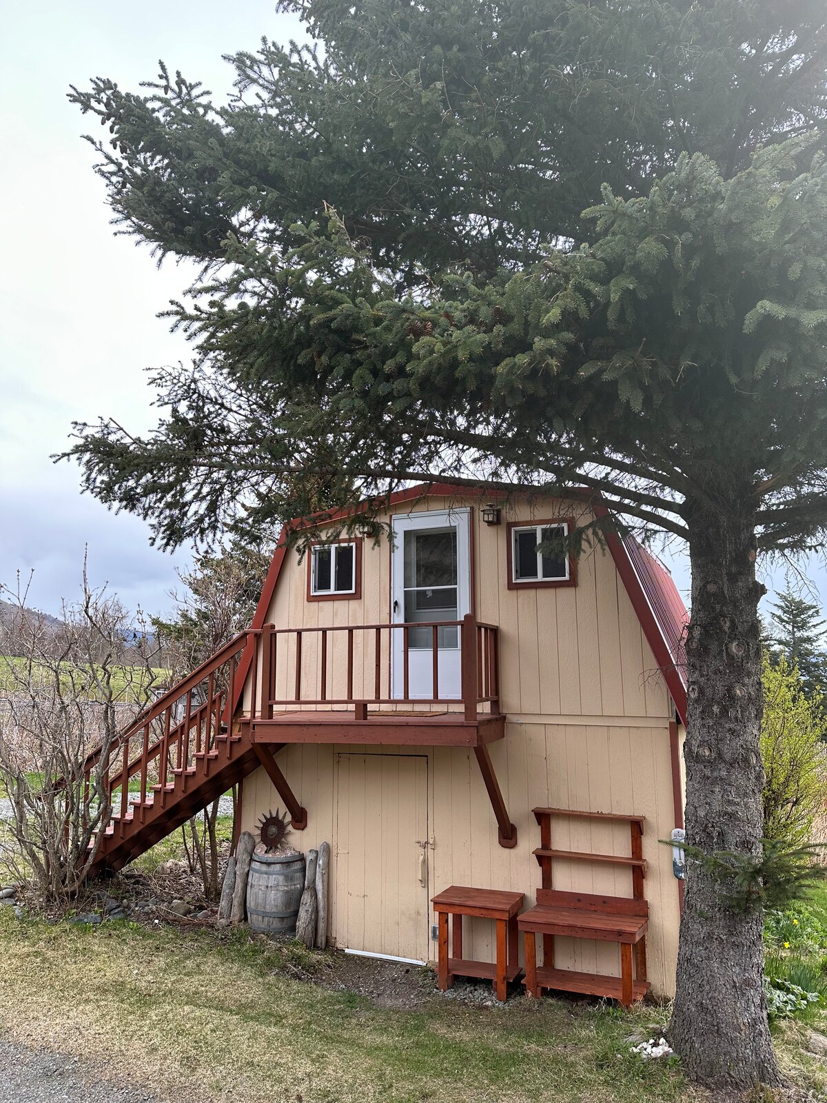 Midnight Sun tiny home is nestled in the middle of a family owned working hay field. From the tiny home you will experience breathtaking panoramic views of Kachemak Bay, Grewingk Glacier, Poots Peak, Gull Island, the Homer Spit and more can easily be seen from the bay view windows. Enjoy a calming retreat from the hustle and bustle of town, and still be less than 10 minutes away from the Spit and downtown Homer.