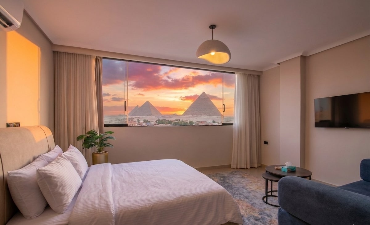 ピラミッドの素晴らしい眺めを最前列で楽しめる素晴らしいワンルームです。 ピラミッドを見渡せる宿泊施設としては最もアクセスしやすく、幹線道路沿いにあり、新しい大エジプト考古学博物館のすぐ隣にあります。 この新しく家具が取り付けられた日当たりの良いワンルームは、エジプト旅行中の便利で快適な滞在にぴったりです。