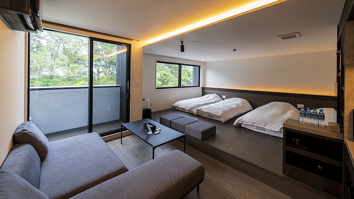 【ファミリールームナチュラル】キッチンと4つのベッドを備えており、3名以上での旅行に最適です