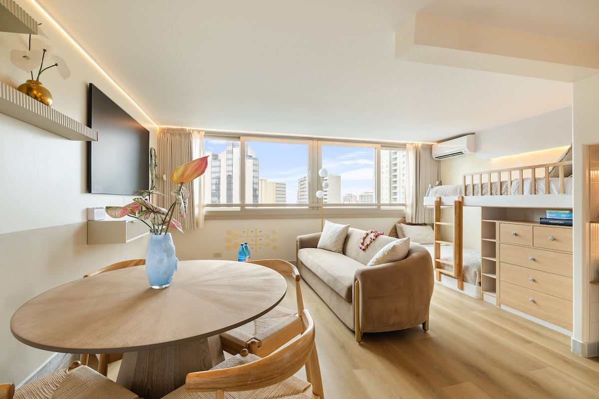 最高のロケーション:ワイキキの中心部、高層階、メインのワイキキビーチから徒歩2分! アロハ、パラダイスが呼んでいます。一部海、山、街の景色を眺めながらコーヒーをお楽しみください。 この風通しの良い専用スタジオには、豪華なクイーンベッド、硬いツインソファベッド(身長175cm以下のゲストにおすすめ)、フルバスルーム、簡易キッチンが備わっています。お気に入りの映画をストリーミングしたり、リモートワークをするための高速インターネットを無料でご利用いただけます。満室になる前に今すぐご予約を!