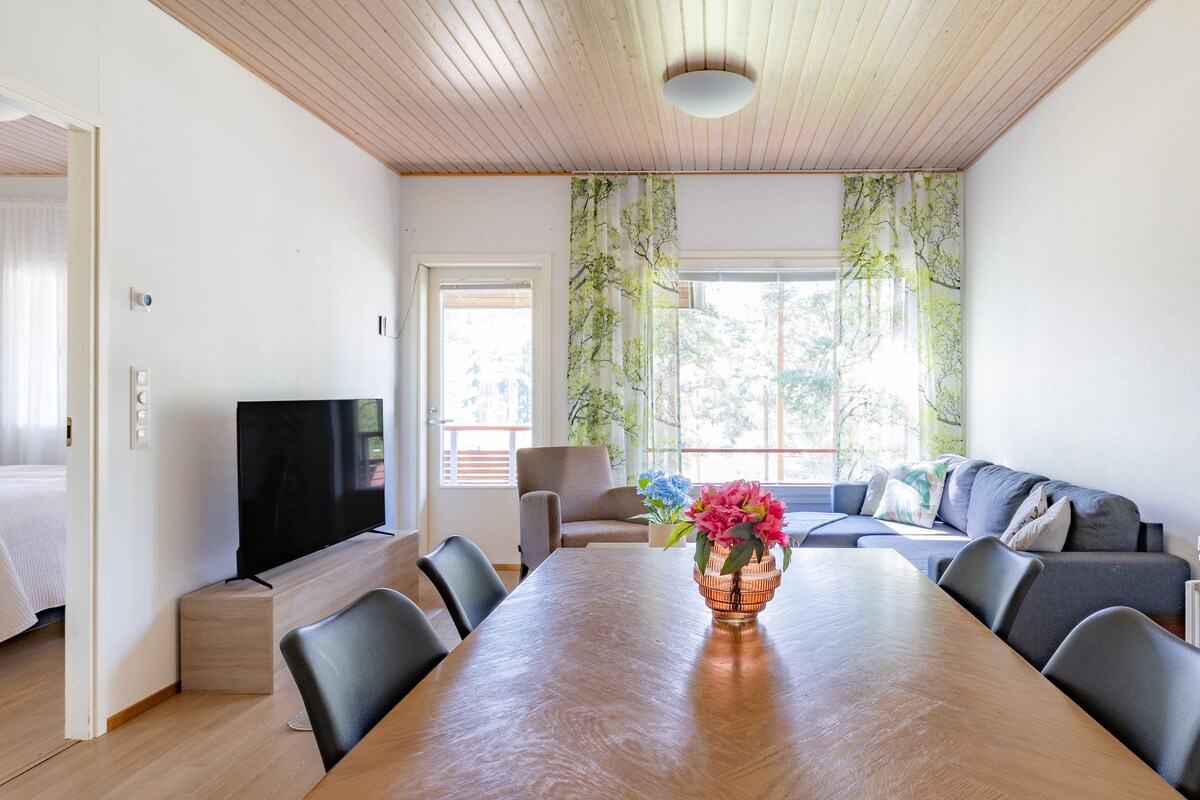 村から10 kmの湖畔にある設備の整ったログハウス。自然の静けさと、モダンな快適さを備えたプライベートビーチをお楽しみください。 近くにはハイキング、ベリーピッキング、狩猟に最適な地形に加え、スキーやスノーモービルのトレイルもあります。UKKトレイルは近くから始まります。ウッコハラとパルヤッカまで40分です。 湖畔のサウナ、桟橋、手漕ぎボート、薪を使ったバーベキュー小屋が含まれています。ペット歓迎。 穏やかな立地で、年間を通じてリラックスするのに最適な場所です。
