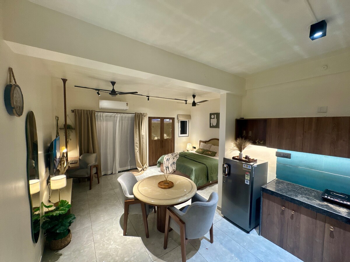 この快適なワンルームアパートは、カップルにとって理想的なロマンチックな逃避場所です。 パロレムビーチの中心部に位置し、モダンなインテリア、広々としたキングサイズのベッド、庭の景色を楽しめる素敵な屋外シットアウト、設備の整ったキッチンを備えています。 専用のワークステーションをご利用いただけるため、ご滞在を楽しみながら仕事にも取り組むことができます。 スクーターレンタルは玄関先で利用できるので便利で、現地を探索したり、宿泊施設から離れて時間を過ごすことができます。