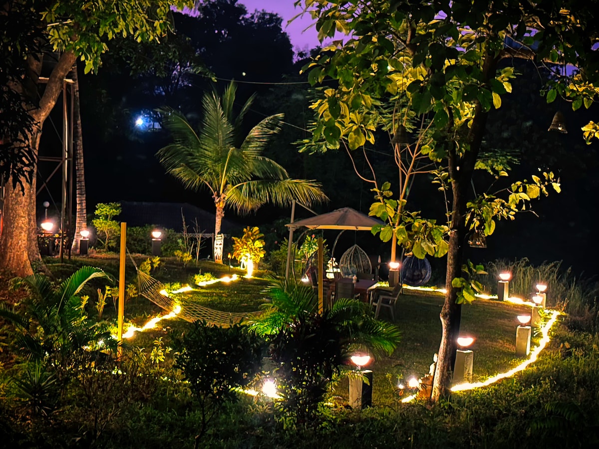 街を脱出し、家族と一緒に自然の中で若返りましょう。この半エーカーの平和で美しく修復されたファームハウスには、専用の小川があります! 宿泊施設には複数の芝生があり、木々や植物が豊富にあります。この家は、ビルマ産チーク材のドアと窓、スペイン産タイル、オリジナルのチーク材とローズウッドの家具を備えたゴアン/ポルトガルスタイルに改装されています。 前後のバルコニーでリラックスし、広大な庭の照明と夜の焚き火をお楽しみください!