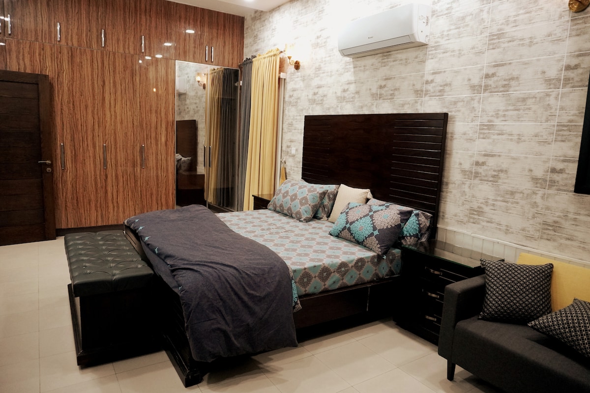 DHAフェーズ5/6近くのシェードハウスへようこそ。ファミリーやグループ向けに設計された豪華な3ベッドルームの宿泊先です。素晴らしいアンビエント照明、居心地の良い雰囲気、高級なブークレ生地のベッドを備えたモダンな家具をお楽しみください。キングサイズのベッド3台(2階に2台、1階に1台)があり、6名様が快適にご宿泊いただけます。65インチのLED、美しいビリヤード台、エアコン、敷地内駐車場などが備わっています。快適さ、スタイル、そしてDHAの最高のスポットに近いプレミアムな滞在を求める方に最適な隠れ家です。