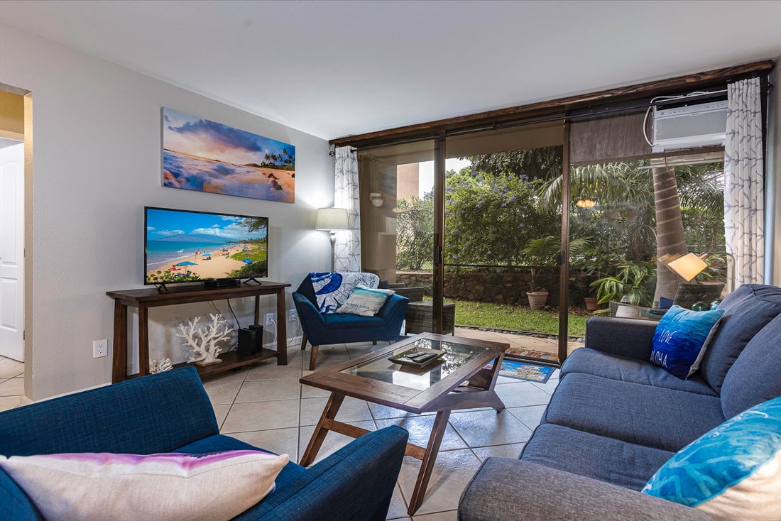 Come unwind in this newly remodeled 2BD/2BA condo next to the world famous Charley Young/ Kamaole beaches. Gorgeous tropical garden view! Master bedroom has a queen size bed, TV, AC & en-suite bathroom. 2nd bedroom has large closet & its own AC. Spacious living room, with large screen TV & AC, comes with a comfortable couch that also turns into a full-size sleeper sofa. Cozy kitchen is equipped with everything you need to cook & enjoy. The complex features a swimming pool, jacuzzi & BBQ grills.