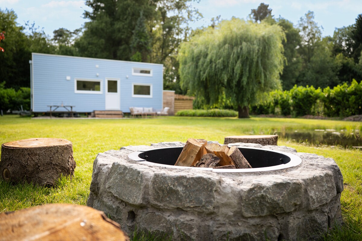 池と焚き火台を備えたのどかなタイニーハウス