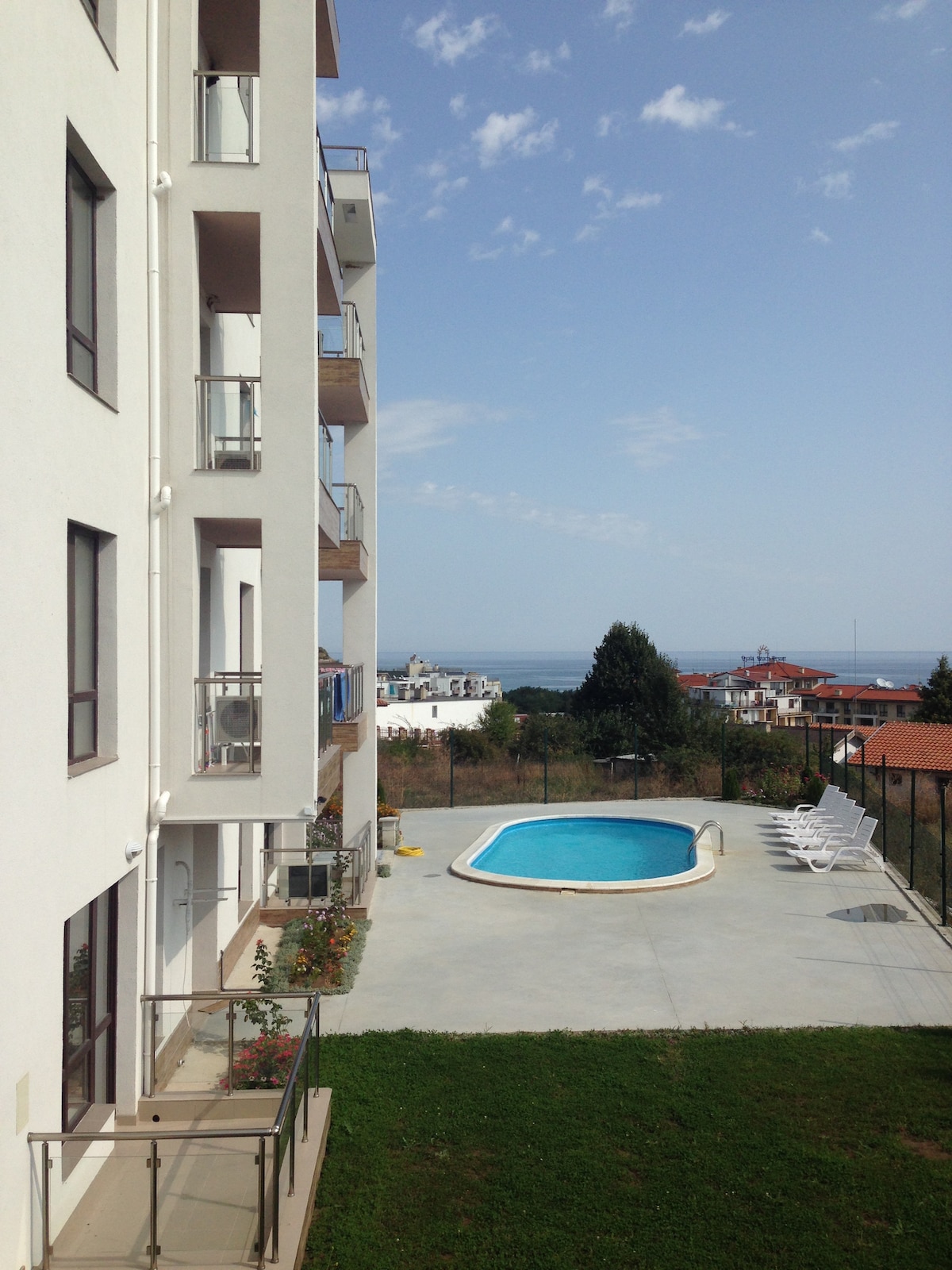 海とプールを見下ろすアパート